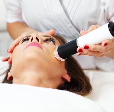 A skincare professional applies a chemical solution to the skin during a peeling facial to exfoliate and remove dead skin cells, revealing smoother, healthier skin underneath. We customize peeling facials based on the type of peel, which can range from superficial to medium-depth and deep chemical peels.